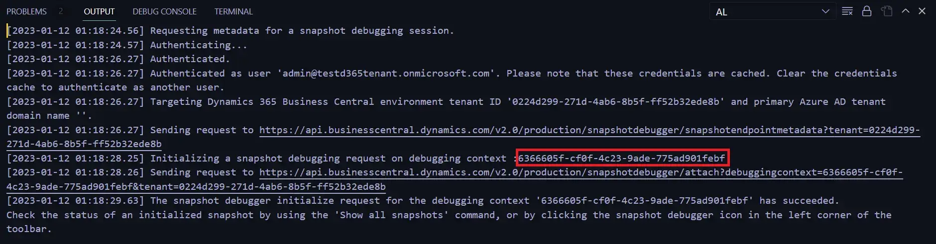 Now It starts a new snapshot debugging session and the session id will show in the output console: - Reload the Business Central in the browser and it will notify details of the snapshot debugger session as per the below: